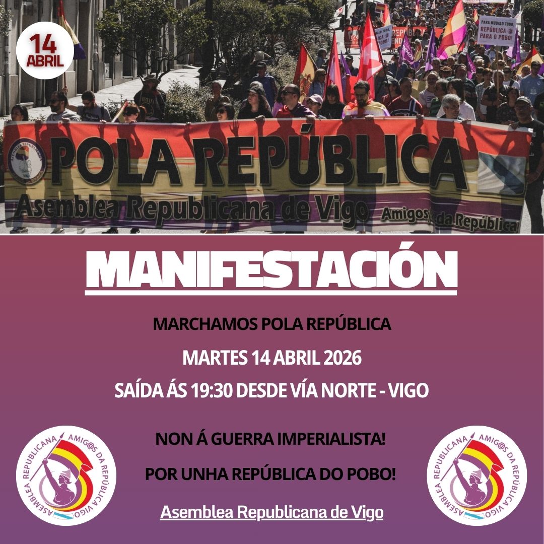 O próximo martes 14 de abril, os vigueses e viguesas e o conxunto dos veciños e veciñas da comarca voltamos saír ás rúas de Vigo en marcha pola República. A Asemblea Republicana de Vigo convoca unha nova manifestación que sairá do cruzamento da Vía Norte coa rúa Urzáiz ás 19:30 horas do devandito día, rematando, un ano máis, na Porta do Sol, diante da rúa da II República.